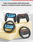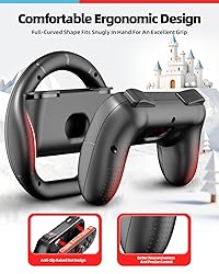 Universal Compatibility: Designed for Nintendo Switch 2, can also work with Switch 1 and Switch OLED Joy-Con controllers by simply attaching the included wrist strap. A cost-effective solution that saves you from buying separate accessories for each console. Ergonomic Design: The Switch2 steering wheel ergonomically mirrors a real wheel for authentic feel, while the joycon grips feature a full, rounded Pro Controller-like shape for a secure, comfortable hold. So you can game for hours without fatigue. Responsive SL/SR Buttons: Engineered with oversized, hyper-responsive SL/SR buttons for instant input recognition. Whether it's drifting in Mario Kart or jumping, flipping, and other actions in Mario Party, every move registers without lag. Stay in control and react with confidence. Easy Setup & Quick Release: For NS2, simply insert the Joy-Con into the docking groove. For NS1/OLED, slide the wrist strap onto the Joy-Con first, then insert it into the docking groove. Removal is effortless—just push the Joy-Con out through the rear opening to release it instantly. Secure Wrist Strap (For Switch 1/OLED only): Includes premium anti-slip wrist strap with reinforced safety lanyard - specially engineered to prevent controller drops during intense motion-controlled games.(Not compatible with Switch 2) Premium Protection & Durability: Constructed with premium durable ABS plastic, this steering wheel and grip provides superior impact resistance and scratch protection. The package includes four silicone joystick caps to preserve your original analog sticks from wear.