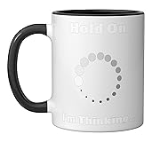 This funny nerd loading design with a loading symbol and the quote Hold On I'm Thinking is perfect for boys, girls, men, women, engineers, computer programmers, Math teachers and pupils, gamers, and everyone who buffers to think. Make everyone laugh with this funny processing or buffering design. This is a great idea to make everyone laugh to wear when you are working, studying, gaming, or in serious life situations and doing a deep thought. 11-ounce ceramic mug is dishwasher and microwave-safe, lead and BPA free Features glossy finish with accent colors on interior, handle, and rim of two-tone designs