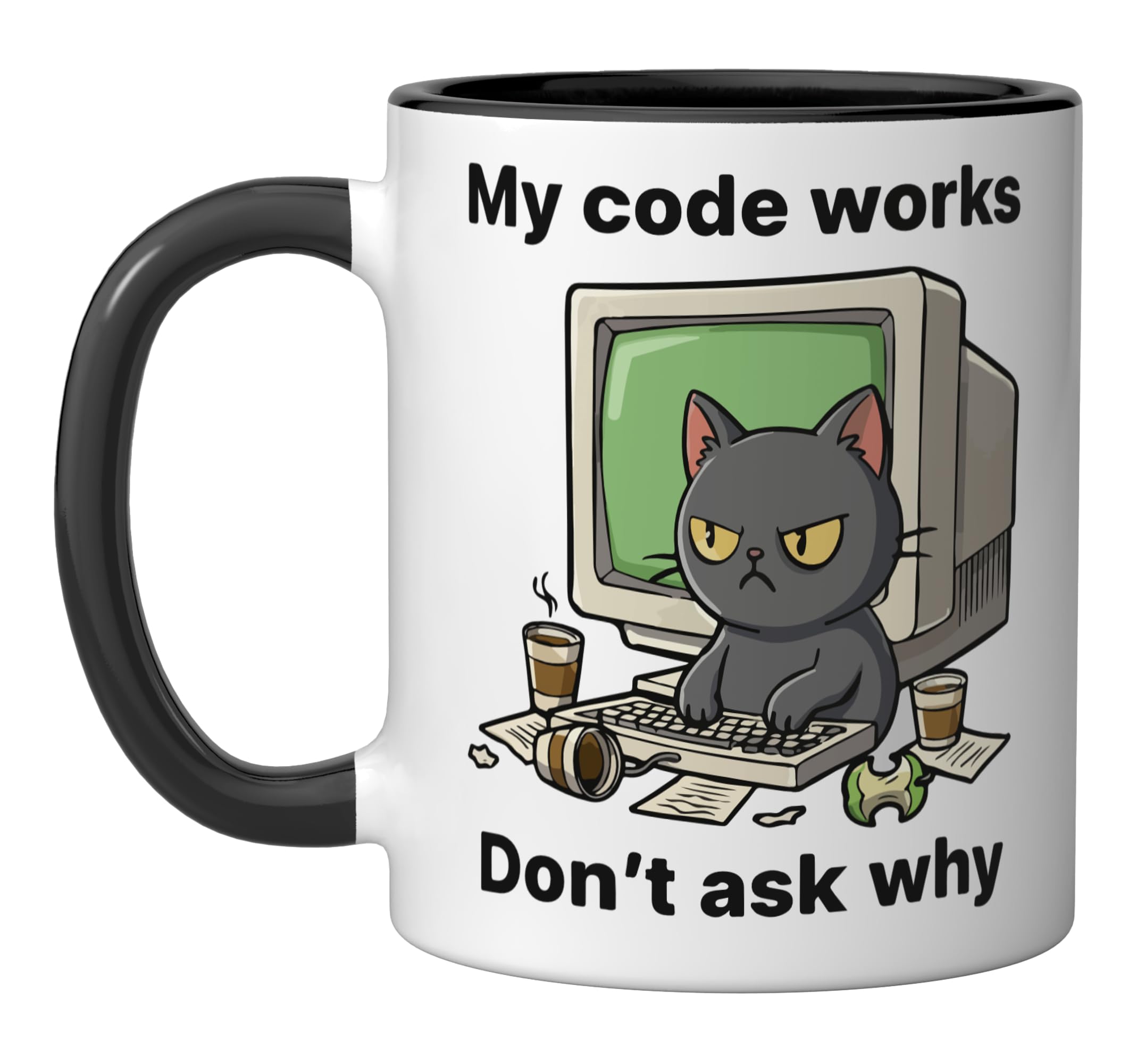 - This vibrant design is perfect for software engineers, coding students, and IT specialists. It features a grumpy-looking cat at a desktop computer, surrounded by a coffee cup and papers, perfectly illustrating the code-debugging process. A must-have for every IT specialist.