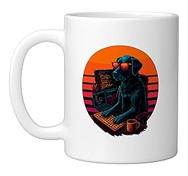 This retro dog design shows a cool pup with keyboard coding software developer, perfect for proud developers and professionals. A great present for dog lovers, dedicated developers, and anyone who enjoys their job with style and humor. 11-ounce ceramic mug is dishwasher and microwave-safe, lead and BPA free Features glossy finish with accent colors on interior, handle, and rim of two-tone designs