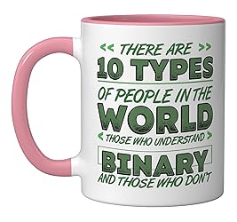 Perfect coding themed design for programmers and developers no matter what programming language. Funny outfit for studying computer science or for work if you love to code. There are 10 types of people. Those who understand binary and those who don't. Funny binary saying for programmers who write commands and codes with binary codes. 11-ounce ceramic mug is dishwasher and microwave-safe, lead and BPA free Features glossy finish with accent colors on interior, handle, and rim of two-tone designs