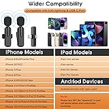- Why Choose the Wireless Lavalier MicrophoneEasy ConnectionCompared with wired microphone, the wireless mic has no messy cables. No extra adapter cable, applications or batteries is needed. Your recording will not be limited by distance. Just get the receiver into your device, and the transmitter will auto-matching at once, then you can start taking video or audio recordingsOmnidirectional Pick upHigh density spray-proof sponge and high-sensitivity microphone enable 360-degree sound reception within the distance of 50ft. ( no obstacles in between)Wider Compatibility Work with both iOS and Android system. That is to say, the bluetooth lavalier microphone can work with all the iPhone & iPad series, including the latest iPhone 15 and iPad Pro series. The wireless lapel mic can be applied to livestreaming, podcasting, interviewing, YouTube video recording, vloggingCompact and ExquisiteThe total weight of the cordless microphone kit is 20g. It is convenient for you to carry the kit when recording or making videos outdoors. With mini size, you can easily clip the wireless lavalier microphone on your shirt or pocket to free your handsIntelligent Noise ReductionThe wireless mic in-built noise canceling technology can effectively reduce vocal echoing and background noise. The high sensitivity mic reduces the interference of the surrounding environment so as to provide professional clean and clear audio