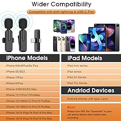 Wider Compatibility: The upgraded wireless clip-on microphone is packed together with a receiver, which is equipped with both a lightning and a USB C plug, making it possible to work with both iOS and android system. That is to say, the bluetooth lavalier microphone can work with all the iPhone & iPad series, including the latest iPhone 15 and iPad Pro series which is usb c port, making it convenient for content creators to make recordings for podcasting, vlogging, live streaming interviewing 2 Clip on Microphones(360°Rotatable): The bluetooth lapel microphone is designed with lavalier feature and 360°Rotatable clips, which means that you can change to any direction you want while you’re making recordings. More importantly, the microphone’s clip can be largely protected from being broken easily, because you don’t have to take it off your microphone before changing direction Easy Connection & User-Friendly: The microphone is very easy to use. Just put the receiver into your cell phone and press the power button on the mic, you will see there is a solid green light on both of the receiver and the mic, which means the two parts are connected successfully. Then you can start audio/video recording Universal Wireless System: The wireless mic adopts blue tooth technology allowing you to move your body freely and no longer to be restricted to the wires while making recordings. You can either hold it on your hand or clip it onto your shirt and record at a remote distance. Without messy wire, it will be very convenient for influencers to do audio/video recording on different social media platforms like Youtube, Tiktok, etc. Omnidirectional Sound Reception & Noise Cancellation: Equipped with intelligent chip, the wireless microphone can record sounds from all directions and cuts off noise from surrounding environment to ensure you a clear and clean sound quality