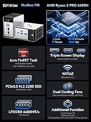 PREMIUM OFFICE GAMING PC MINI COMPUTER - The Nucbox M8 Mini PC is a small form factor Desktop Micro Mini Computer with an AMD Ryzen 5 PRO 6650H (6C/12T 3.30Ghz Base speed with Turbo speed up to 4.5Ghz) processor. The GPU is integrated with a powerful AMD Radeon 660M 12 Cores Graphics Card; Experience smooth, lag-free performance that handles everything from mid-range gaming sessions to 4K video editing with ease. BLAZING-FAST MEMORY SPEED & STORAGE EXPANSION - Fly through tasks with ultra-fast 16GB LPDDR5 6400MT/S RAM and a 512GB NVMe SSD. With dual M.2 2280 slots supporting up to 4TB per slot, 8TB total storage, you have immense room for your entire game library, projects, and media files. ULTIMATE CONNECTIVITY FOR GAMERS & PROS - Unlock desktop-level graphics with the exclusive Oculink port for a direct, high-speed eGPU connection. Plus, a versatile USB4 port (40Gbps, PD Charging, Video) offers incredible flexibility for the ultimate gaming or workstation setup. HYPER-SPEED TRANSFERS & DUAL LAN POWER - Transfer large files in seconds with USB 3.2 Gen2 ports (10Gbps) and WiFi 6E. The dual 2.5GbE LAN ports enable advanced networking, link aggregation for double the speed, or hosting a powerful server, all from a device that fits in your hand. COMMAND A TRIPLE DISPLAY WORKSTATION - Create an immersive and highly productive multi-display setup. Connect up to three displays simultaneously using the combination of HDMI 2.0, DisplayPort 1.4, and USB4/DP ports for a seamless workflow or an epic, multi-screen gaming work environment. UPGRADED DUAL COOLING FANS - Our improved and new cooling fan design uses larger top and bottom cooling fans with 360 degrees in and out air flow. The copper pipes keeps the system running cool and quiet. THREE PERFORMANCE MODES & UPDATED UEFI (BIOS) - The M8 Mini PC features an all new BIOS update with three performance modes (Quiet 28W, Balance 35W, or Performance 40W). VRAM Allocation is also possible with Auto Power On, Wake-on-LAN options available GMKtec Warranty- GMKtec offers a 1-year limited warranty for each mini PC, starting from the date of the purchase. All defects due to design and workmanship are covered. With a professional after sales team always ready to attend to your needs, you can simply relax and enjoy your mini PC