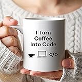 DESIGN: White ceramic mug featuring "I Turn Coffee Into Code" quote with laptop and coffee cup icons, perfect for programmers and developers CAPACITY: Standard 11-ounce size mug ideal for your daily coffee, tea, or favorite hot beverage GIFT-WORTHY: Perfect present for software engineers, tech enthusiasts, coders, and programming professionals VERSATILE USE: Suitable for both hot and cold beverages, microwave-safe for convenient reheating PRACTICAL: Comfortable handle grip and durable ceramic construction for everyday use