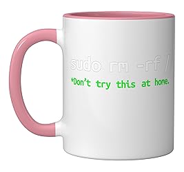 Perfect for software developers, programmers, Linux users, Unix enthusiasts, system administrators, sysadmins, IT professionals, computer science students, coding bootcamp students, DevOps engineers, web developers, software engineers, tech professionals, Celebrates programming culture with a witty warning message displayed in terminal-style green text that tech professionals immediately recognize as a playful reference to dangerous system commands, with the asterisk adding an extra layer of command line hu 11-ounce ceramic mug is dishwasher and microwave-safe, lead and BPA free Features glossy finish with accent colors on interior, handle, and rim of two-tone designs