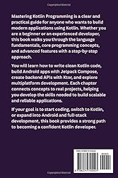 - Learn to build modern, scalable applications with Kotlin, the official language for Android development and a powerful tool for backend systems and multiplatform projects.Mastering Kotlin Programming takes you from absolute beginner to confident developer through a structured, hands-on approach. Whether you are new to programming or transitioning from Java, Python, or JavaScript, this book provides clear explanations, real-world examples, and two complete portfolio-worthy projects.What You Will LearnStart with the fundamentals of Kotlin syntax, variables, functions, and control flow. Master null safety, the feature that eliminates the billion-dollar mistake of NullPointerExceptions. Build expertise in object-oriented programming with classes, interfaces, inheritance, and sealed classes. Apply functional programming techniques using lambdas, higher-order functions, and the collections API.Write asynchronous, non-blocking code with coroutines, Dispatchers, and Flow for reactive state management. Build modern Android applications using Jetpack Compose for declarative UI design. Implement professional architecture patterns including ViewModel, Repository, and Navigation. Connect to REST APIs with Retrofit and manage local data persistence with Room database.Develop scalable backend services using the Ktor framework. Share business logic across platforms with Kotlin Multiplatform. Test your applications with unit tests and UI tests. Deploy Android apps to Google Play Store and backend services using Docker.Two Complete Projects IncludedRecipeFinder Android App: A multi-screen application with API integration, local database storage, offline functionality, and modern UI with Jetpack Compose.SharedList Full-Stack System: A complete backend API built with Ktor and a multiplatform shared library demonstrating code reuse across Android and other platforms.Who This Book Is ForAbsolute beginners who want to learn programming from scratch. Developers from other languages looking to master Kotlin. Anyone preparing to build Android applications with modern best practices. Programmers interested in backend development or multiplatform projects.Every concept is explained step-by-step with practical examples and real-world applications. Code samples are production-ready and follow industry standards. You will gain the skills to architect, build, test, and deploy professional Kotlin applications across multiple platforms.Start your journey to becoming a confident Kotlin developer today.