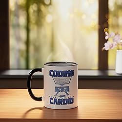 Coding themed motif for computer scientists, software engineers and debugging nerds who love coding. Coding Is My Cardio. 11-ounce ceramic mug is dishwasher and microwave-safe, lead and BPA free Features glossy finish with accent colors on interior, handle, and rim of two-tone designs