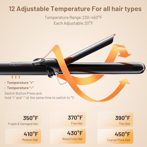 - 【Precise Temperature Control】: The Clamp curling iron offers 12 temperature settings (230~450℉) + an LED display, suitable for all hair types. NTC real-time temperature adjustment allows for precise operation, letting you easily choose the temperature best for your hair type. It minimizes heat damage, creating shiny, bouncy, and healthy curls.