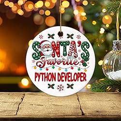 - Celebrate Your First Christmas with Monizilucky Ceramic Ornament Commemorate your career milestone with this ceramic ornament featuring the Santa's Favorite Python Developer Christmas Ornament 2025 quote. Funny gift for Python Developer, new professionals, or Christmas enthusiasts, this personalized Christmas ornament adds a festive, profession-themed touch to Christmas trees, home decor, or office displays. Ideal for self-gifting to celebrate your new career or as a thoughtful holiday present from family, friends, or colleagues. Elegant & Durable Design Crafted from high-quality ceramic with a glossy finish, this festive ornament uses UV printing for vibrant, fade-resistant designs on both sides. Lightweight with an included loop, it’s funny gift for Christmas tree decor or as a holiday keepsake. Note: Actual color may vary slightly due to monitor or light effects. How to Use: Hang on a tree, wreath, or display; avoid rough handling to maintain finish. Meaningful Holiday Gift This 2025 Christmas gift is ideal for Secret Santa, Christmas parties, or as a memorable keepsake for new professionals. Made with safe, non-toxic materials, it’s a sustainable choice for festive shoppers. Care Tip: Store in a cool, dry place to preserve quality. Add this Monizilucky Ceramic Christmas Ornament to your holiday decor and celebrate your career milestone in style!