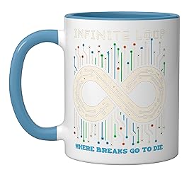 Discover our Infinite Loop design collection featuring endless loop, programming humor, and recursion graphics. Perfect for coders, developers, and geeks. Show off your debugging skills, loop iteration expertise, and love for coding jokes. Celebrate your coding passion with our Infinite Loop graphics! From while true loop and infinite loop coder designs to funny coding and infinite loop memes. Great for programmers, developers, and enthusiasts who appreciate debugging and recursion 11-ounce ceramic mug is dishwasher and microwave-safe, lead and BPA free Features glossy finish with accent colors on interior, handle, and rim of two-tone designs