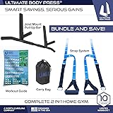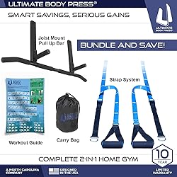 - Anchor Your Bodyweight Gym: Ultimate Joist Mount Pull Up Bar & Body Weight Trainer BundleTransform your garage, basement, or home gym with the ultimate foundation for bodyweight training. The Ultimate Body Press Joist Mount Pull Up Bar and Body Weight Resistance Trainer Bundle provides a fixed, heavy-duty anchor point and a versatile, commercial-grade suspension system for full-body strength, core, and functional training.The Joist Mount Pull Up Bar is the cornerstone of your strength routine. Engineered for stability, this heavy-duty steel bar is through-bolted to your exposed ceiling joists, offering a rock-solid, 350lb capacity anchor that is always ready. The overhead design ensures full range of motion for pull-ups, chin-ups, and neutral-grip pull-ups (featuring 21-inch parallel spacing to target the upper lats).Paired with the stability of the pull-up bar, the Body Weight Resistance Trainer unlocks hundreds of full-body movements. Built with premium, commercial-grade materials, the innovative Lay-Flat Design and contoured handles guarantee a "zero scrape" experience, allowing you to focus purely on your form and resistance. Quick S-Hooks anchor instantly to your Joist Mount Bar, providing a quick, unbreakable setup. With indexed straps for precision adjustment and a full-size exercise guide included, you can start progressing immediately, no matter your fitness level.This bundle provides the complete equipment and instruction needed to build a powerful physique through consistent, unlimited bodyweight workouts.