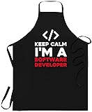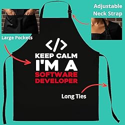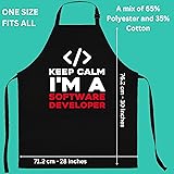 STURDY POLY-COTTON BLEND: Made with a strong polyester and cotton mix to resist stains. Cleans easily in the washing machine. ADJUSTS FOR ALL SIZES: The neck strap slides to adjust and the long ties fit any waist, making it great for everyone. KEEP CALM I'M A SOFTWARE DEVELOPER - A perfect piece to give to friends and family alike. Apron PERFECT GIFT FOR FRIENDS AND FAMILY - Have someone close to you who is or will one day one day become a software developer? Are you a software developer yourself? Apron TWO POCKETS: Two large pockets on the front provide plenty of room for your tools and phone.