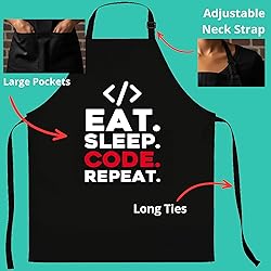 - Turn your kitchen into the ultimate compilation station with this Programmer Apron, dedicated to coders, developers, and software engineers who know that cooking is just an algorithm with edible output. This design celebrates the coding lifestyle and serves as the perfect gear to protect you from runtime errors like sauce splatters and oil spills while you debug your dinner recipes. Made from comfortable and durable cotton polyester, it features an adjustable fit suitable for long coding marathons or weekend BBQ sessions, making it the perfect techie gift for Python experts, Java masters, or full-stack developers so they can execute their favorite meals with zero bugs and maximum flavor.