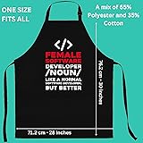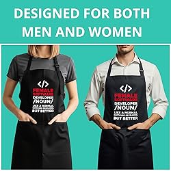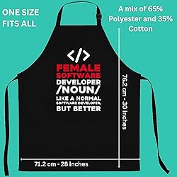 STURDY POLY-COTTON BLEND: Made with a strong polyester and cotton mix to resist stains. Cleans easily in the washing machine. ADJUSTS FOR ALL SIZES: The neck strap slides to adjust and the long ties fit any waist, making it great for everyone. Wear this and let others know you're a proud female software developer! Apron This makes a great birthday or Christmas present. Apron TWO POCKETS: Two large pockets on the front provide plenty of room for your tools and phone.