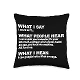 Perfect for information technology professionals and systems administrators and network engineers and software developers and computer programmers and tech-support specialists and help desk technicians and cybersecurity analysts and computer science studen This hilarious and relatable text-based design features a witty three-part breakdown of the life of a technology professional starting with the statement "What I Say I work in IT" followed by the exaggerated expectations of others regarding fixing printers 100% spun-polyester fabric Double-sided print Filled with 100% polyester and sewn closed Individually cut and sewn by hand Spot clean/dry clean only