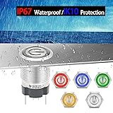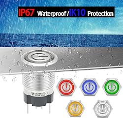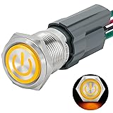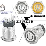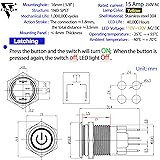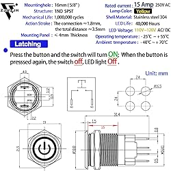 ✅【15 Amp Current Rating, Latching】Push Button Switch Current Rating:15 Amps 250V AC; Yellow LED lamp voltage: 110V-120V DC/AC. Hole size required: 5/8inch / 16mm, Latching Push Button Switch: Push it, ON; Push it again, OFF.♥♥♥(on off switch) ✅【IP67 Waterproof Switch】Our push button switch have CE Certification.♥♥♥ IP67 waterproof switch protection can be used in wet or dusty enviroment. The shell is made of stainless steel 304 material, which is very sturdy and durable. ✅【110V Yellow Light】The push button light switch light ring adopts a unique design, with a toothed circular transparent cover, making the light source more bright and eye-catching. LED light life: 40000 hours. Using AC/DC LED lamp, the terminals have no difference of anode and cathode. Button mechanical life: 1,000,000 cycles. ✅【 UL Listed】Our metal push-button switches are UL/CE/TUV/CCC certified, RoHS compliant, eco-friendly and durable. Contact material: Silver Alloy, SPST ,1 Normally Open. 4.8 mm wide X 0.8 mm thickness terminal pin for 15A high current use. Two green wires connect the device input and output, and the red and black wires (LED polarity free) connect to the power supply. ✅【Package】Package include : 1 * 16 mm Push Button Switch 15A , 1 * Wire Socket Plug 1.5mm².Waterproof switch is widely used: pc power button,marine switch,car switch,Household Appliances.