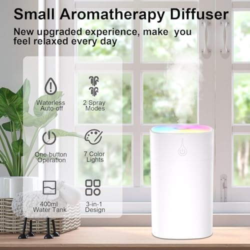 400ml Small Diffuser - Mini Essential Oil Diffuser for Desk, Small Humidifier Aromatherapy Diffusers for Home, Waterless Auto-Off Aroma Diffusers with 7-Color Night Light for Bedroom