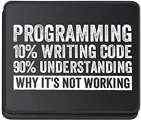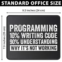 ULTRA-SMOOTH SURFACE: Optimized fine-weave texture ensures pixel-perfect tracking and responsive control for all optical and laser mice. Perfect for Gaming and high-precision tasks. NON-SLIP & STABLE: Heavy-grip, textured rubber base prevents unwanted movement, keeping the mouse pad firmly secured on your desk for maximum control. Programming % writing code 90% understanding why it' not mousemat working mousemat Great coding developer and computer coder design for men, women and coding lover. If you are searching for computer science, coding nerd or software developer and pc coder this is mousemat for you mousepads WATERPROOF & DURABLE: Features anti-fray stitched edges and a spill-resistant coating for easy cleanup and long-term durability. A reliable desk mat built to last.