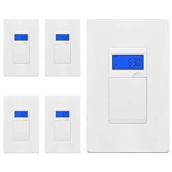 AUTOMATIC LIGHT SWITCH TIMER - Automatically turn lights, lamps, fans, sprinklers, and motors ON/OFF at the times and days you program the programmable timer switch for safety and security PROGRAMMABLE TIMER - 18 unique ON/OFF settings, 7-day programming. Two modes: Manual (Normal ON/OFF switch) Automatic (Controls Load according to program) WALL TIMER SWITCH - Replaces a standard switch utilizing current wiring in the junction box. Ni-MH battery will store time/program settings in case of power outage; use RCL feature to recall your last setting EASY PROGRAMMING - Quick and easy programming allows you to schedule both work days and weekends grouped, or schedule for every day; use RND feature to randomize load times for extra security when you are away; includes DST daylight savings settings NEUTRAL WIRE REQUIRED - US & Canada UL LISTED safety checked. 5 Pack. Resistive 15A/1800W, Voltage 120VAC, 60Hz, Tungsten 1200W, Fan motor: 1/2HP. Single Pole only. Not for 3-way use. Screwless Wall Plate included