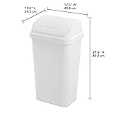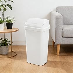 - The Kitchen Trash Can, 13 Gallon Plastic Garbage Bin with Swing Top Lid, White combines modern style and practical convenience for busy kitchens. Its sleek square design and textured finish complement any home decor while providing durable daily use. The swing-top lid allows for effortless one-handed disposal, even when the can is placed flush against a wall or cabinet. Sized for standard 13-gallon liners, this sturdy plastic garbage bin keeps your kitchen organized and makes cleanup quick and simple. Perfect for kitchens, garages, or workspaces, it’s a reliable and stylish waste solution for any home.