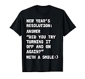 - Start the new year exactly like every IT person expects – answering “Did you try turning it off and on again?” on repeat. This funny IT New Year’s resolution tee is made for tech support, helpdesk heroes, sysadmins, programmers, and office problem-solvers who spend all year fixing things they didn’t break. The clean text-only design reads: “NEW YEAR’S RESOLUTION: ANSWER ‘DID YOU TRY TURNING IT OFF AND ON AGAIN?’ WITH A SMILE.” Simple, bold, and instantly relatable to anyone in IT.