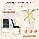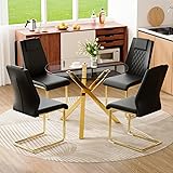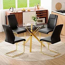 Modern Dining Table Set for 4: This 5 piece dining set pairs a clear small round glass table with 4 black faux leather cantilever chairs and and gold metal bases, creating a chic modern glam look that brightens and visually enlarges apartments, condos and breakfast nooks Small Round Dining Table Set: 39"D x 30"H tempered glass top comfortably seats 2–4 people, perfect as a round glass dining table set or gold dining table set suitable for small spaces without overwhelming your room Adjustable Feets for Sturdy and Safty: This small glass dining table set for 4 thick tempered glass top with smooth rounded edges sits on a cross-shaped gold metal base for excellent stability. Adjustable leveling feet on the table legs help keep this kitchen table and chairs set of 4 steady on slightly uneven floors while protecting wood or tile surfaces Dual Chair Pads for Sturdy and Durable: TThe chairs of this modern dining table set for 4 feature soft foam padding, smooth faux leather upholstery and diamond stitching for a refined look. Gold-tone cantilever bases provide gentle flex and solid support. This round kitchen table set for 4 is equipped with two types of floor pads—a fixed white anti-slip pad plus an additional adjustable leveling pad—helping protect your floors, reduce noise and keep the chair stable on slightly uneven surfaces Easy to Clean & Assemble: Glass, metal and faux leather surfaces wipe clean in seconds—perfect for using this circle dining table set for 4 in busy kitchens or dining rooms. All hardware and step-by-step illustrated instructions are included so 1 adult can assemble modern dining table set for 4 with ease