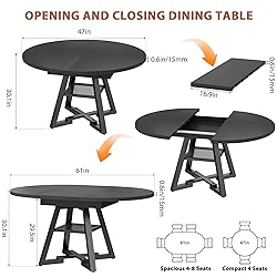EXTENDABLE ROUND TABLE:Start at a spacious table for 4–8 people . Extend to 63" to comfortably fit 6–8 guests. The round shape optimizes every inch of space, making conversations more natural and dining more enjoyable—ideal for family meals and social gatherings. IDEAL FOR 6–8 FAMILY DINNERS:(Includes 1 Dining Table) Designed for family meals and entertaining, this extendable round dining table seats 4–8 people with ease. Perfect for daily dinners, holiday feasts, parties, and casual gatherings—instantly transforming your kitchen or dining room into a warm and welcoming centerpiece. EXTRA LARGE STORAGE SPACE: A Thoughtfully designed storage shelf is for organizing tableware and kitchen essentials, keeping them easily within reach. It helps maintain a clean, clutter tabletop while providing convenient access to everything you need. Round dining table maximizes the usable area of the dining table, round dining table for 4-8, ideal for family meals and gatherings. SPACE SAVING DESIGN: The cross-shaped base provides ample space and legroom for diners, while allowing stools to be easily tucked underneath. Its compact design makes this an ideal choice for kitchen&dining room, and apartments. DURABLE BUILD & MODERN STYLE:Made with a thick 36mm MDF top that’s heat-resistant, scratch-proof, and water-repellent to withstand daily wear. The pedestal base adds stability, and the smooth extension mechanism with secure clamps ensures easy and safe expansion. Clean lines and a textured wood-grain finish elevate any modern or traditional home décor. FAST & EASY ASSEMBLY:Comes with detailed instructions, labeled parts, and pre-drilled holes for a quick, accurate setup. Need help? Contact us anytime—we respond within 24 hours.