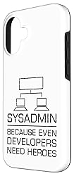 Sysadmin because even Developersneed heroes is a funny gift idea for every developer, hacker, coder and programmer that do programming, coding, debugging table. If you study information technology or science, tell them about the bits and bytes. Funny System Admin Even Developers Need Heroes Nerd PC is a perfect gift for everyone who loves coding and developing new computer langues. Perfect as a birthday or christmas gift for an engineer, programmer or someone who loves technology. Two-part protective case made from a premium scratch-resistant polycarbonate shell and shock absorbent TPU liner protects against drops Printed in the USA Easy installation