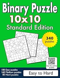 - This puzzle book contains 340 binary puzzles with solutions, of which:100 Easy 10x10 binary puzzles160 Medium 10x10 binary puzzles80 Hard 10x10 binary puzzlesPerfect for beginners and all binary puzzle lovers. Features:10x10 grid format.A mix of difficulty levels for beginners and puzzle enthusiasts.Solutions provided at the end of the book.