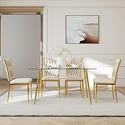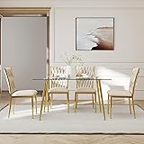 KATBOC 51-Inch Rectangular Glass Dining Table Set with 4 Woven Velvet Upholstered Dining Chairs with Gold Metal Legs, Modern Kitchen/Dining Room Furniture(Beige&Gold)
