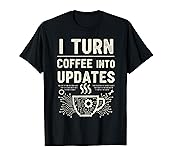 I Turn Coffee Into Updates funny programmer design for developers, coders, software engineers, computer geek, helpdesk, system admins, IT support, and tech geeks who live on coffee and turn caffeine into code, updates. Perfect nerd humor style. Great idea for programmers, developers, engineers, IT coworkers, coders, tech dads, moms, or friends. Ideal for birthdays, Christmas, hackathons, coding sessions, coffee breaks, or casual work from home outfits. Lightweight, Classic fit, Double-needle sleeve and bottom hem