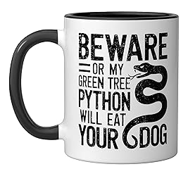 Green tree python design for a passionate green tree python owner or green tree python breeder. 11-ounce ceramic mug is dishwasher and microwave-safe, lead and BPA free Features glossy finish with accent colors on interior, handle, and rim of two-tone designs