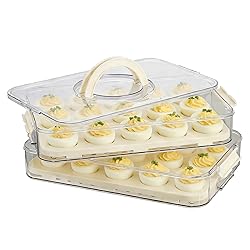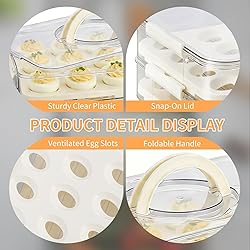 Unique 2-Layer Design - This deviled egg holder features two layers, each storing 20 eggs, keeping your deviled eggs organized and stable during storage, transport, or display at parties Stackable for Space Saving - Stackable deviled egg containers with lid allow easy storage in the fridge or on the countertop, keeping your kitchen tidy while protecting your eggs Convenient Travel and Parties - The deviled egg travel container with handle makes it effortless to carry deviled eggs to family gatherings, picnics, or celebrations while keeping them neatly in place Reusable and Easy to Use - This plastic deviled egg containers with lid set is reusable and designed for simple hand washing, providing a convenient and practical solution for repeated use Versatile Serving and Storage - The deviled egg holder with lid is perfect for serving or storing eggs, suitable for parties, picnics, holiday celebrations, or everyday kitchen use