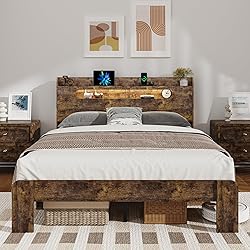 - The Ultimate Full Bed: Where Farmhouse Charm Meets Modern Innovation Elegant & Functional Design This Vintage Brown full bed frame serves as the stunning focal point of your room. It combines the warmth of rustic farmhouse style with the clean utility of a modern platform bed, requiring no box spring. Integrated Charging & Display Hub The two-tier shelf headboard offers ample space to organize books, decor, and electronics. It features a built-in charging station with 2 AC outlets and 2 USB ports to power all your devices conveniently at bedside. Customizable Ambient Lighting Create any atmosphere with the RGB LED lights embedded in the headboard. Control colors, modes, and brightness via remote or app for movie nights, reading, or relaxation. Includes a practical soft-glow night light. Quiet, Rock-Solid Support Experience exceptional stability through a hybrid wood/metal build, reinforced legs, and a locfull Velcro slat system. The high footboard and EVA-mute sponge work together to minimize mattress shift, squeaks, and wobbles for undisturbed sleep. Smart Storage Solutions Maximize your bedroom’s potential. The elevated frame design creates valuable under-bed storage space for bins and luggage, while allowing effortless cleaning with a robot vacuum. Quick, Tool-Included Assembly Designed for a hassle-free setup. All components, tools, and instructions are packed in one box. With numbered parts and an intuitive hook-and-loop slat system, two people can assemble it in approximately 45 minutes.
