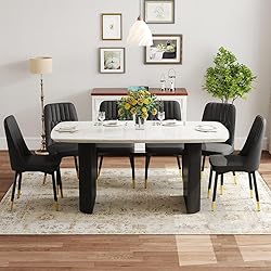 Spacious Modern Dining Table Set: With a 67'' × 35.4'' oval dining tabletop, this white marble dining table set with metal chairs comfortably seats 6 people, optimizing dining space for everyday meals, family gatherings, or holiday celebrations Thick and Durable 3.5'' Marble-Patterned Tabletop: Designed with a solid 3.5'' thick marble-patterned surface, this white dining table set for 6 offers enhanced durability. Rounded corners add safety, making the modern dining table set a family-friendly option for households with kids Stable Modern Dining Table and Chairs Set: Crafted from premium wood and metal, the dining table and chairs set supports up to 250 lbs of meals and décor. Even when kids move around, the modern dining table set for 6 remains steady and safe. Easy to Clean and Assemble: The smooth, seamless tabletop resists stains and scratches, while the faux leather chairs are easy to wipe clean after daily use. This modern dining table and chairs includes clear instructions and all necessary tools, allowing for quick assembly within 30 minutes Modern White Marble Design: Featuring a white marble-patterned tabletop paired with matte black column legs and matching chairs, this 7 piece dining table set blends modern elegance with functionality—ideal for kitchens, dining rooms, or meeting spaces.