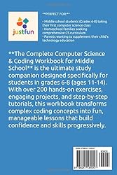 - **Is your middle schooler ready to master the language of the future?** In today's technology-driven world, computer science isn't just for future programmers—it's an essential skill for every student. Whether your child dreams of creating video games, building websites, or simply wants to understand how the digital world works, this comprehensive workbook provides the perfect foundation. **The Complete Computer Science & Coding Workbook for Middle School** is the ultimate study companion designed specifically for students in grades 6-8 (ages 11-14). With over 200 hands-on exercises, engaging projects, and step-by-step tutorials, this workbook transforms complex coding concepts into fun, manageable lessons that build confidence and skills progressively. **COMPLETE CURRICULUM COVERAGE** This workbook covers everything a middle school student needs to build a strong computer science foundation: **FEATURES THAT SUPPORT LEARNING** ✓ **Complete Answer Key:** Every exercise includes answers so students can check their work and learn from mistakes. Parents and teachers can easily assess progress. ✓ **Learning Objectives:** Each chapter opens with clear "What You'll Learn" goals so students know exactly what they're working toward. ✓ **Chapter Summaries:** Key takeaways at the end of each chapter reinforce learning and aid retention. ✓ **Brain Teasers & Logic Puzzles:** Screen-free activities throughout the book develop computational thinking skills without requiring a computer. ✓ **Common Mistakes Warnings:** Special callout boxes alert students to frequent errors and how to avoid them—preventing frustration before it starts. ✓ **Did You Know? Facts:** Fascinating tidbits about computing history and fun facts keep students engaged and curious. ✓ **Real-World Connections:** Every section connects concepts to real applications students encounter daily. ✓ **Quick Reference Cards:** Handy Python, HTML, and CSS reference sheets students can use while coding. ✓ **Achievement Tracker:** A built-in progress tracker lets students celebrate their accomplishments as they advance through the book. ✓ **Difficulty Ratings:** Exercises are rated from beginner to expert, allowing students to challenge themselves appropriately. **ALIGNED WITH EDUCATIONAL STANDARDS** This workbook aligns with CSTA (Computer Science Teachers Association) K-12 standards, making it suitable for classroom use, homeschool curricula, after-school programs, or independent study. The content also supports ISTE standards and Next Generation Science Standards (NGSS) for technology education. **PERFECT FOR:** • Middle school students (Grades 6-8) taking their first computer science class • Homeschool families seeking comprehensive CS curriculum • Parents wanting to supplement their child's technology education • Teachers looking for student workbook materials with answer keys • After-school coding clubs and summer programs • Self-motivated students curious about programming **FOR PARENTS AND TEACHERS** A dedicated Parent & Teacher Guide provides: • Suggested pacing for classroom or home use • Tips for supporting student learning • Ideas for extending lessons with hands-on projects • Links to free online resources including Scratch, Python, and web development tools **START YOUR CHILD'S CODING JOURNEY TODAY** Computer science opens doors to creativity, problem-solving, and future career opportunities in virtually every field. With **The Complete Computer Science & Coding Workbook for Middle School**, your student will build confidence, develop critical thinking skills, and discover the joy of creating with code. No prior experience required. Just curiosity, a pencil, and the willingness to learn.