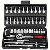 - Tackle home, auto, and DIY repairs with this 46-Piece Tool Set—a comprehensive kit packed with sockets, screwdriver bits, a ratchet wrench, and accessories, all organized in a durable storage case! The set includes multiple sizes of chrome-plated sockets (resistant to corrosion) and a variety of screwdriver bits (for different fastener types), paired with a reversible ratchet wrench (for efficient tightening/loosening). The sturdy plastic case keeps all tools organized and portable, so you can grab the kit for quick fixes or projects. Ideal for homeowners, hobbyists, or casual mechanics, this versatile set covers most common repair and assembly tasks.