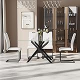 5-Piece Dining Table Set: This set comfortably seats 2-4 guests, which includes 51.18in glass dining table and 4 chairs. The modern style make dining table a versatile addition to the kitchen, dormitory, living room, study room, office and meeting room. Modern glass dining table:51.18" Tempered glass top sits on a durable metal legs. Adjustable leveling feet prevent scratches. Ideal for kitchen, dormitory, living room, study room, office and meeting room. Modern Ergonomic Dining Chairs:The dining chairs featured high backrest which based on ergonomic standard and human body features, comfortable and elegant.The PU leather surface waterproof and easy to clean. Filled with soft sponge offers comfy feeling when you sit on it. The metal frame ensure to it is sturdy and stable Versatile Glass Dining Table Set: This elegant glass dining set isn't just for your dining room. It effortlessly transitions to your kitchen, living room, home office, or even a meeting space. Hassle-Free Cleaning: An accidental spill on your dining chair? No worries! With its easy-to-clean synthetic leather surface, you can effortlessly wipe away the mess, leaving you to focus on the joy of dining, not the chore of cleaning