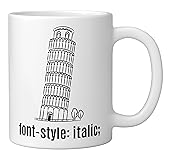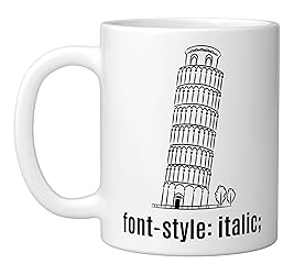 Funny Web Developer visual pun joke 'Font Style: Italic' with the leaning Pisa tower. Makes a nerdy gift idea for any programmer, web developer, web designer, front-end developer, software engineer, ux designer, product designer, student, nerd, geek. Funny programmer joke with Pisa tower graphic illustration and CSS quote. This geeky inside joke makes witty statement at the office, college, school. Ideal for someone with Italian heritage, Italian-American. 11-ounce ceramic mug is dishwasher and microwave-safe, lead and BPA free Features glossy finish with accent colors on interior, handle, and rim of two-tone designs