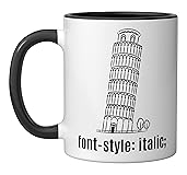 Funny Web Developer visual pun joke 'Font Style: Italic' with the leaning Pisa tower. Makes a nerdy gift idea for any programmer, web developer, web designer, front-end developer, software engineer, ux designer, product designer, student, nerd, geek. Funny programmer joke with Pisa tower graphic illustration and CSS quote. This geeky inside joke makes witty statement at the office, college, school. Ideal for someone with Italian heritage, Italian-American. 11-ounce ceramic mug is dishwasher and microwave-safe, lead and BPA free Features glossy finish with accent colors on interior, handle, and rim of two-tone designs