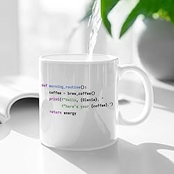 - PERSONALIZED JUST FOR YOU: Click the "Customize Now" button to add a personal touch to your workstation. Replace the placeholder text with your name or a colleague's handle. Whether it's a code comment or a print statement, this mug is uniquely crafted for your daily debugging sessions.CLEVER DEVELOPER HUMOR: This mug features iconic programming syntax that every software professional understands. From the infinite loop of problem-solving to the essential morning function that turns coffee into energy, it’s the perfect insider joke for anyone who speaks in code.PREMIUM QUALITY CERAMIC: Crafted from high-quality, lead-free, and cadmium-free ceramic, this mug is built to last through endless deployment cycles. The high-definition text is printed using advanced techniques, ensuring the code snippets remain sharp and vivid without fading or peeling.OFFICE & HOME ESSENTIAL: Designed for the high-intensity lifestyle of a tech professional, this 11oz mug is 100% safe for the dishwasher and microwave. Easily reheat your fuel during long nights of refactoring or toss it in the wash after a successful project launch.THE ULTIMATE TECH GIFT: Looking for a graduation gift for a Computer Science student or a promotion present for a Senior Engineer? This customizable mug is a thoughtful choice for birthdays, holidays, or office Secret Santa exchanges. It’s a gift that celebrates the art of logic and creativity.
