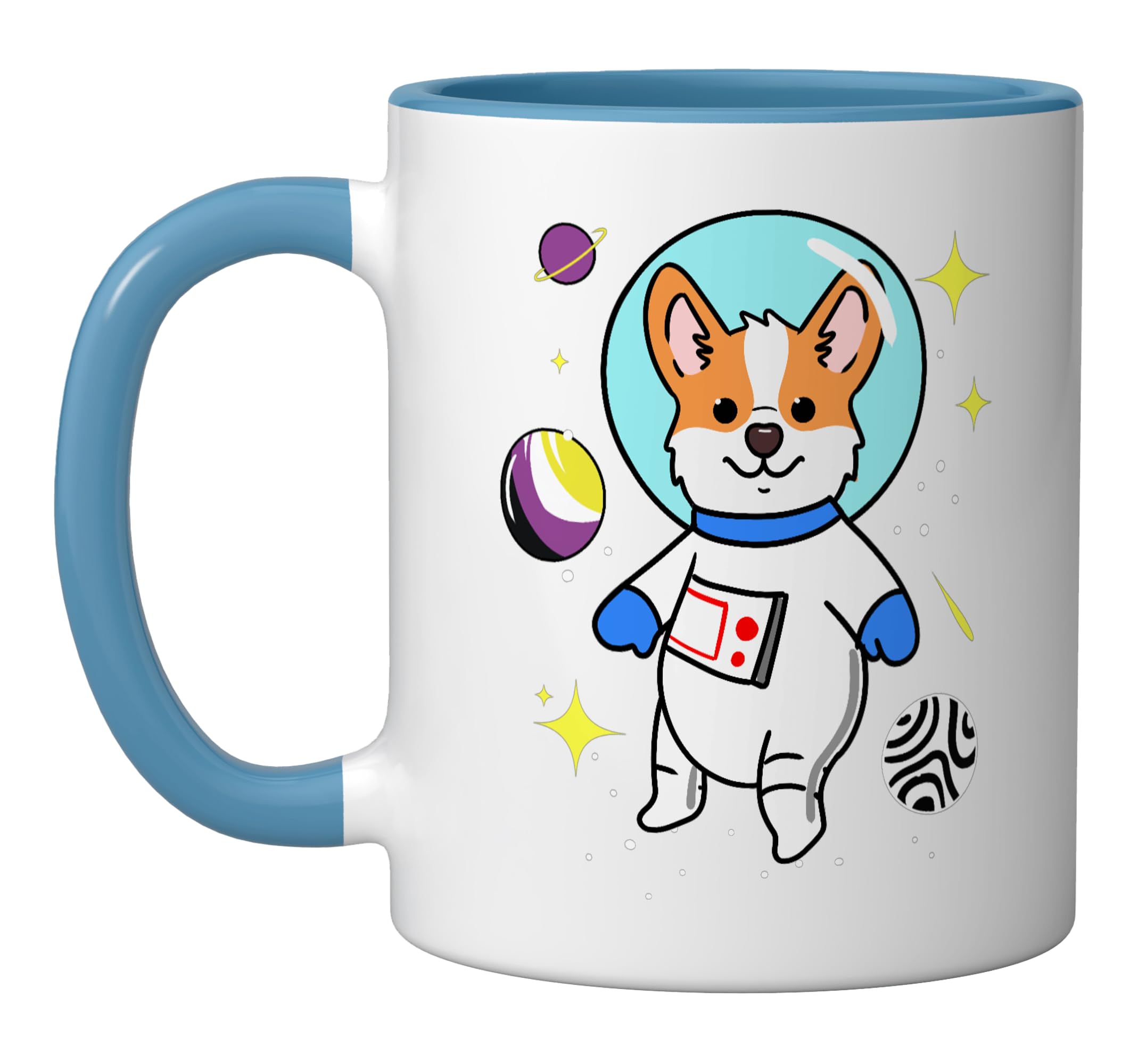 Nonbinary corgi in space. Are you looking for a nonbinary gift for a proud nonbinary pride person celebrating Nonbinary Pride Day? Then grab this nonbinary corgi in space design which shows a corgi astronaut in nonbinary flag colors. 11-ounce ceramic mug is dishwasher and microwave-safe, lead and BPA free Features glossy finish with accent colors on interior, handle, and rim of two-tone designs