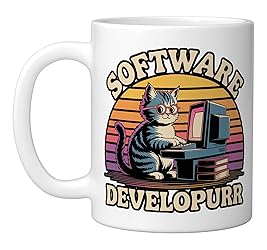 Highlight your coding skills with a design that combines programming and feline charm. When your dev team includes a purring coder. 11-ounce ceramic mug is dishwasher and microwave-safe, lead and BPA free Features glossy finish with accent colors on interior, handle, and rim of two-tone designs