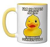Funny programmer duck aying I'm 99 bugs away from the perfect code. Perfect for programmers, coders, and software developers who enjoy a humorous take on debugging, coding, and tech life. A fun way to show passion for technology and computer science. Great for anyone in the tech world, whether engineers, students, or IT professionals who appreciate clever designs that highlight coding humor and spark conversation. 11-ounce ceramic mug is dishwasher and microwave-safe, lead and BPA free Features glossy finish with accent colors on interior, handle, and rim of two-tone designs