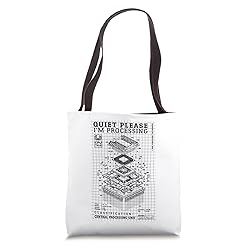 Quiet please I'm processing. Funny technical diagram of pc central processing unit CPU programming computer scientist builder tech computers graphic design. Funny CPU, processor, I'm processing, geek, coding, coder, pc gamer, tech support, programmer and computer builder, user, scientist gifts and network engineer gift ideas for programmers, engineers, coders, students, men, women and kids. 16” x 16” bag with two 14” long and 1” wide black cotton webbing strap handles. Made of a lightweight, spun polyester canvas-like fabric. All seams and stress points are double-stitched for durability, and the reinforced bottom flattens to fit more items and hold larger objects. Spot clean/dry clean only.