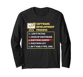 - Great gift for the programmer, software developer, coder or anyone who loves funny coding jokes. Computer nerds & geeks know the Software Development Process: I can't fix this, crisis of confidence, questions career, questions life, oh it was a typo, cool. Don't despair when your program has an error just follow the Software Development Process. You will find the source code error very fast and then you can start testing your computer program again. Funny gift idea for a computer science graduate.