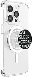 Bold minimalist text layout featuring Eat Sleep Repeat slogan for coders Playful tech humor for software developers and coding enthusiasts Magnetically snaps on and off your phone case so you can easily swap between MagSafe compatible accessories. Adaptor ring included. Make any phone case MagSafe compatible by attaching the adaptor ring. A phone case is required but not included to use the wallet. Printed top is swappable. Close and twist to swap the top with a new design with other compatible PopGrip models.