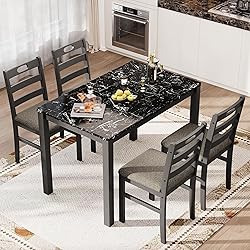 - PHI VILLA 5 Piece Dining Table Set for 4, Marble Design Kitchen Table Chairs Set of 4, Solid Wood Space-Saving Dining Room Table Set for Apartment, Veined Black Marble& Gray