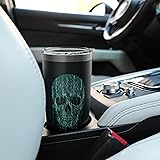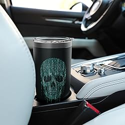 Stylized skull formed from cascading binary and code lines for a tech inspired look Coders developers computer science students and tech enthusiasts Dual wall insulated: keeps beverages hot or cold Stainless Steel, BPA Free Leak proof lid with clear slider